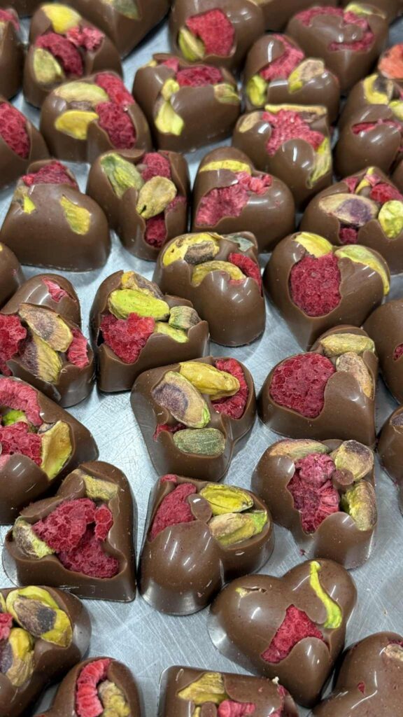 Ryški avietė ir švelniai riešutinė pistacija – vaisiškai kreminis derinys pieniškame šokolade.