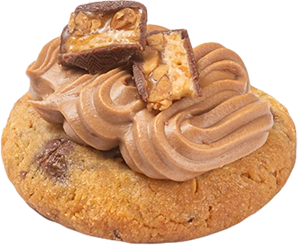 Šokoladinis sausainis su karameliniu ir žemės riešutų kremu, pabarstytas snickers batonėliu