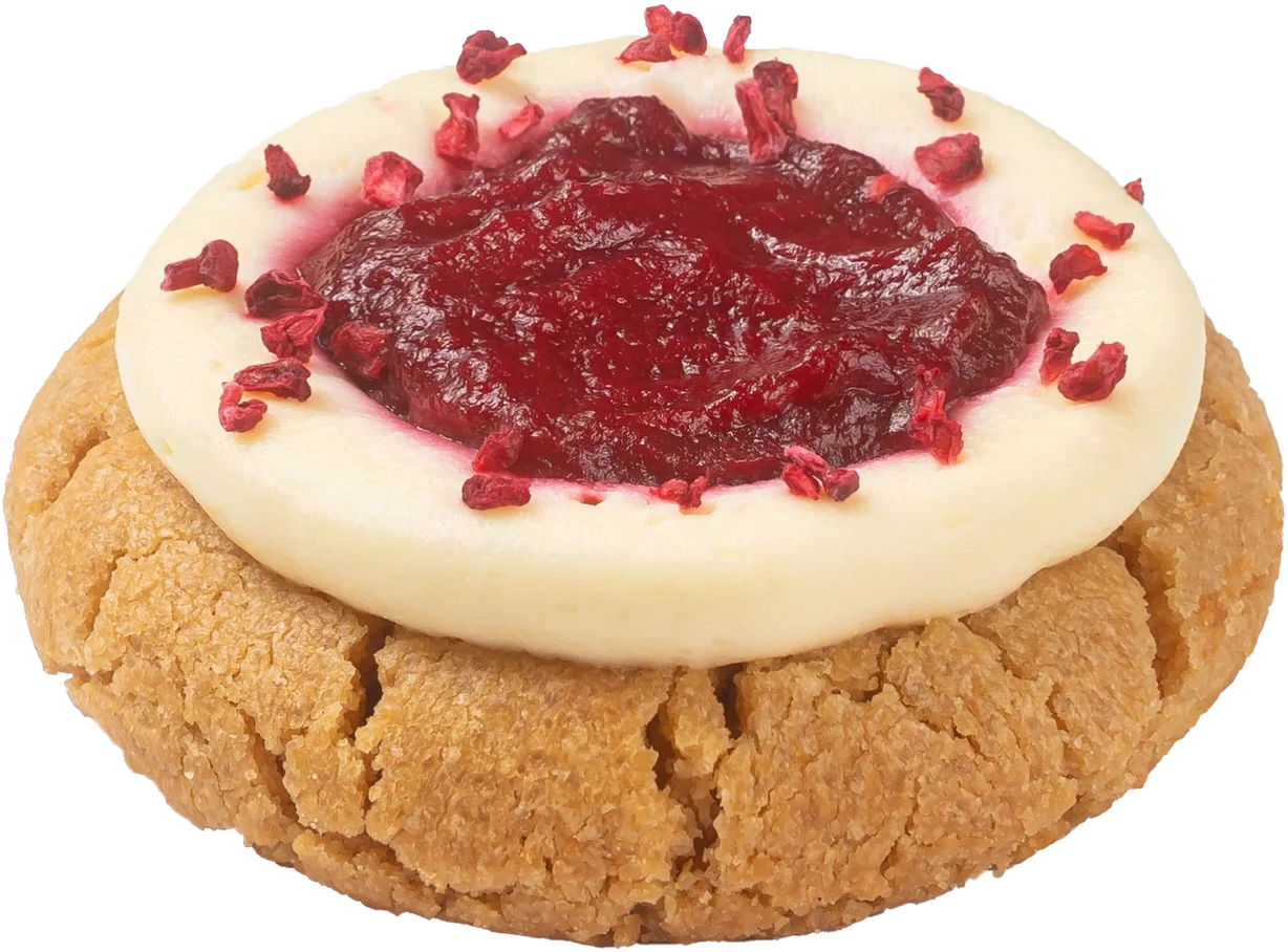 Sausainis su puriu aviečių kremu, pabarstytas džiovintų aviečių trupiniais.