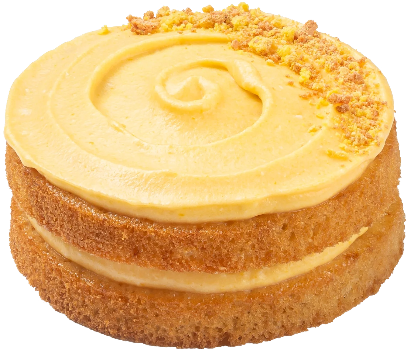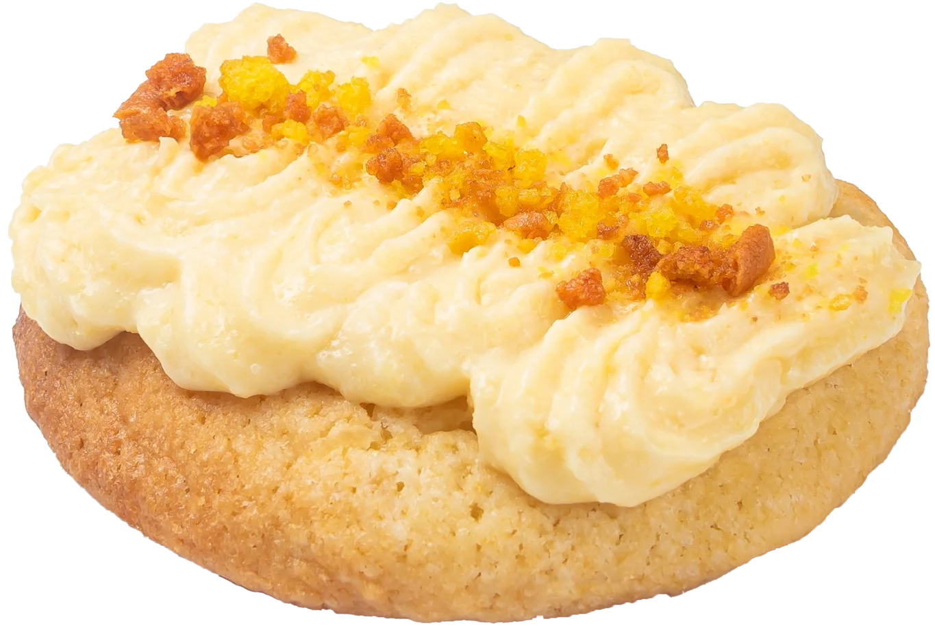 Vanilinis sausainis, padengtas gaiviu citrininiu kremu ir papuoštas traškiais trupiniais.