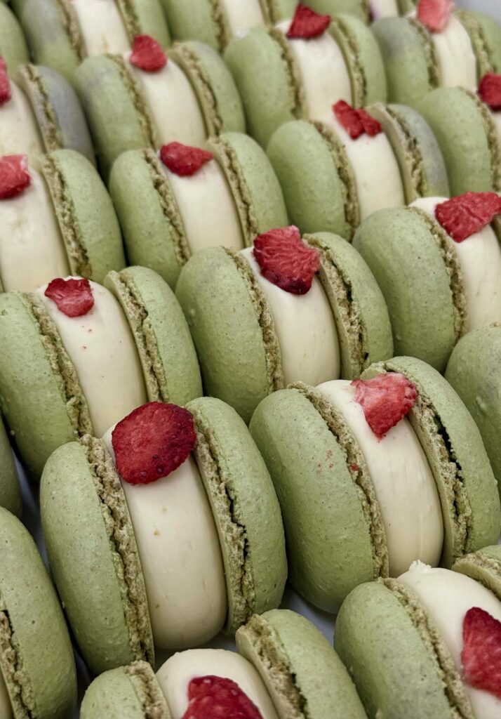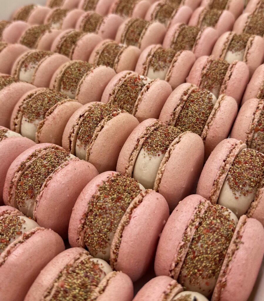 Macarons su prabangiu pistacijų ganašu, baltuoju šokoladu ir gaiviu aviečių tyrės įdaru