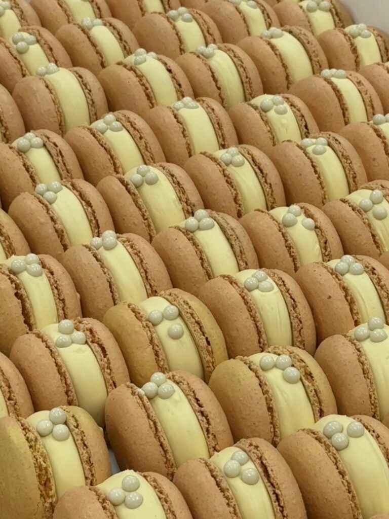 Macarons kuriuose persipina kavos ir japoniškos matchos skoniai, papuošti Valrhona šokolado rutuliukais